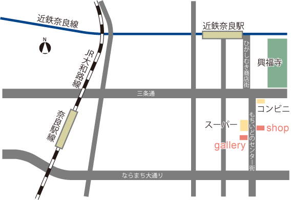 ショップ 期間限定の展示即売会でしか見られなかった弊社の商品が、実際に目で見て、手で触れて品質を確かめていただけるようになりました。近鉄奈良駅から南に続くアーケード通りの餅飯殿商店街の真ん中あたりにあります。商店街を抜けると近年の奈良注目スポット「ならまち」です。 〒630-8322奈良市餅飯殿町14番地 西村ビル1FTEL 0742-25-0255営業時間:10:00~18:00 不定休 Access